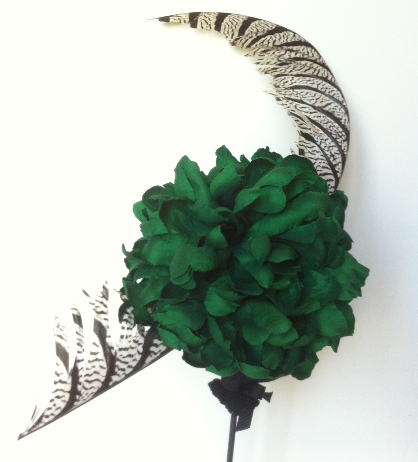 Os presentamos un tocado en forma de crisantemo realizado en seda salvaje verde esmeralda y adornado con una pluma de Faisán Lady Amherst. Este tocado es ideal para dar un toque de color a los tonos nude y pastel de la temporada o combinar con un estampado de flores.